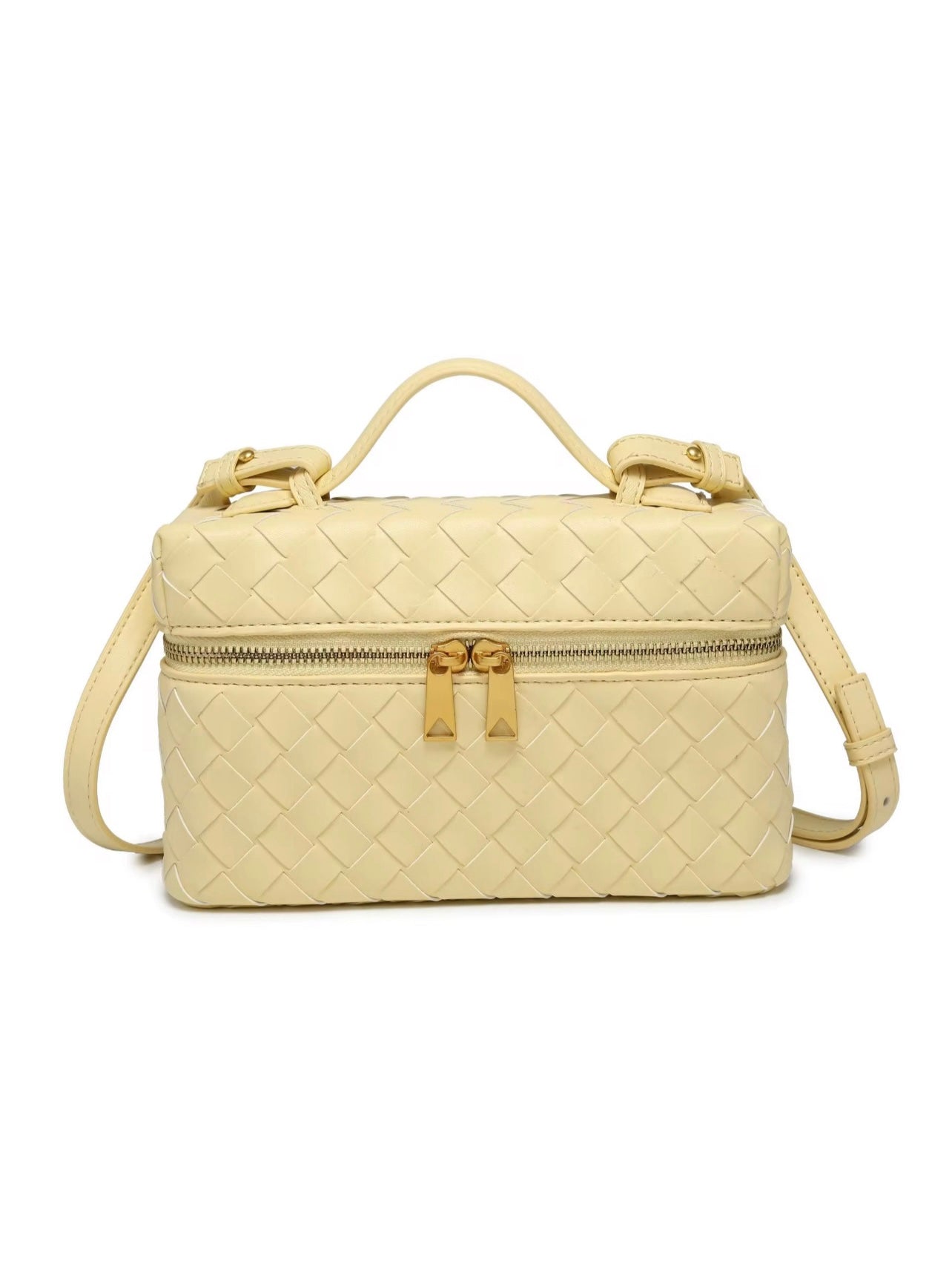 Woven Leather Vanity Bag - comes with a short handle strap and a long strap to be worn as a cross body bag.